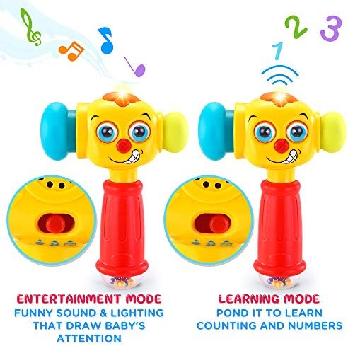 MUSIC & LIGHTING INFANT TOYS THAT DRAW YOUR BABY’S ATTENTION– Each ponding will trigger funny sounds and lights to draw baby’s attention; When press the head button of baby hammer toy, it will play music or songs to attract baby to grab. This baby hammer will improve grabing ablility of your 12 to 18 months up baby.