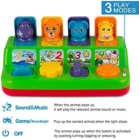 UPGRADED POP-UP TOYS – Not just Pop up!The Interactive Pop-Up Animals toy includes two different play modes.Animal Sound/Music Mode: When the animal pops up,it will play the relevant animal sound or music. Game/Music&Light Mode:Pup up the correct animal,when the light stops.Note: Batteries not included!