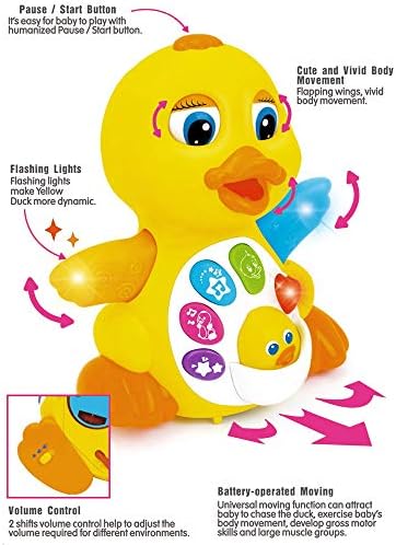 √ Fun Educational Learning Walking Toy: This Musical Duck Toy is smart and moves around, once it hits a wall it turns around and goes the other way. Baby would chase this adorable singing talking duck crawling. Push all the buttons, toddlers delight with it. The music is sweet – definitely not something that will drive a parent crazy, which is good, because kids could watch their musical dancing duck toy all afternoon.