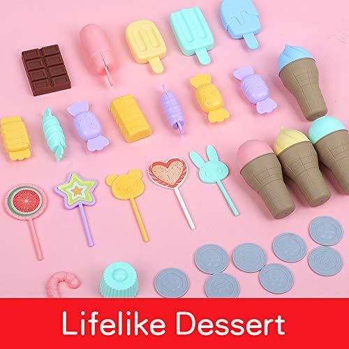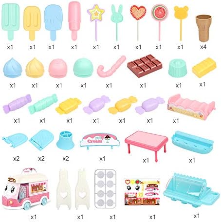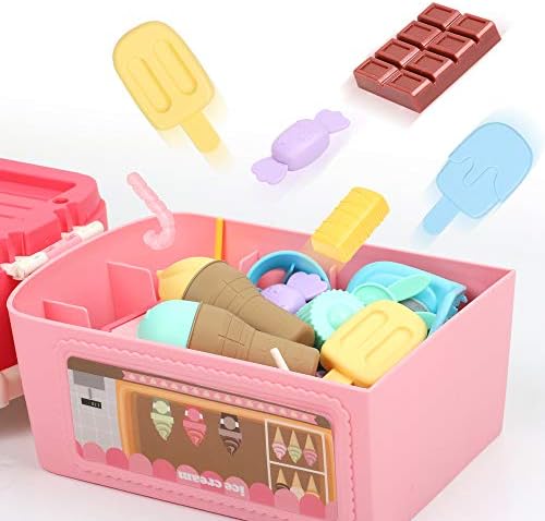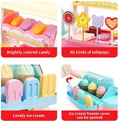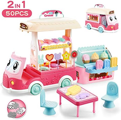 【50 DIFFERENT TOYS FOR ENDLESS FUN】 Our 50-piece ice-cream trolley includes colorful icecream cones, ice-lollies, lollipops, food, table and coins for a realistic ice-cream truck experience!
