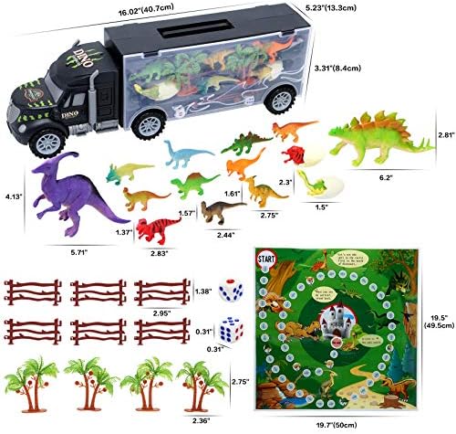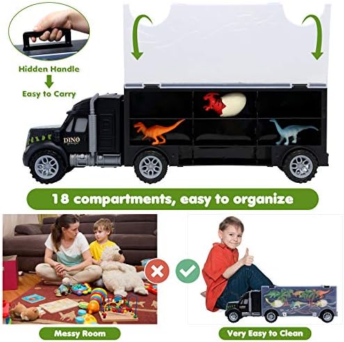 -Our dinosaurs transport car carrier kit includes 18 separate compartments, easy for kids to clean up these dinosaur miniature toys after playing.