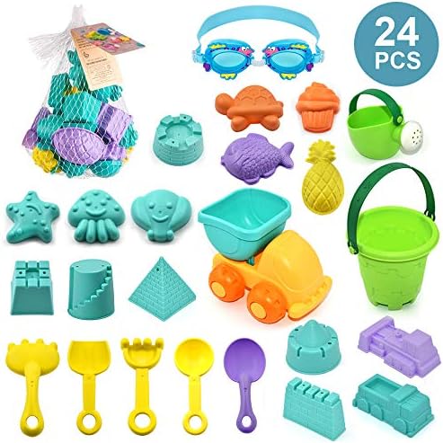 ALL in ONE – 24pcs Beach Toy:7 beach tool kits, 6 castles,5 aquatic creature, 2 vehicles,1 truck, 1 bucket, 1 Pouring kettle, 1 swimming goggles.It’s funny to play with your kids whole day in the summer.Reusable mesh bag for easy storage and travel, convenient to organize assorted beach toys.