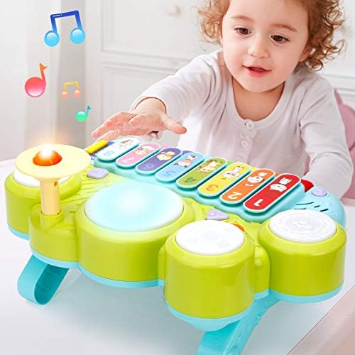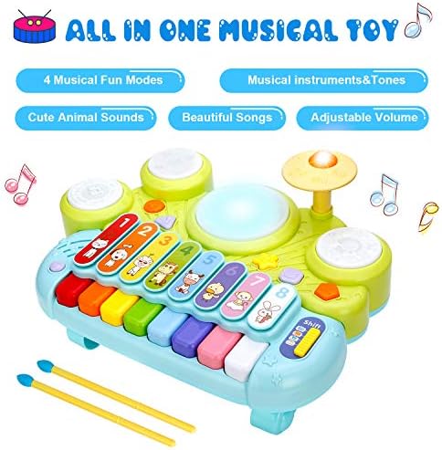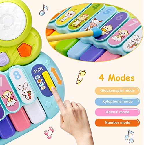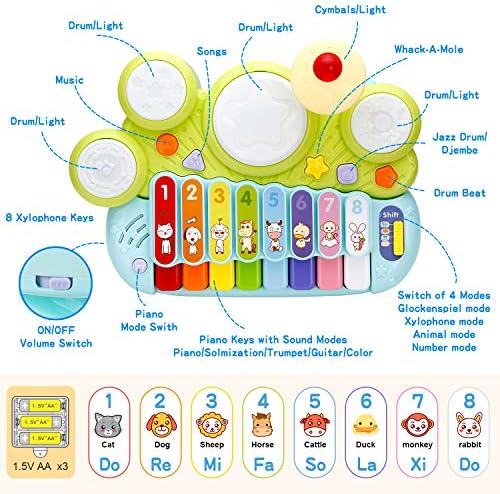 [Various Musical Playing Modes] ① Three Ways to Play Beat Drum Set, including Play mode (Jazz drum & Djembe) , Music mode (9 drum songs & 3 beats), and Whack-a-mole (5 level whack-a-mole game with different difficulty). ② Four Ways to Play Electronic Xylophone: Glockenspiel tone, Xylophone tone, Animal mode with 7 animals sounds, and Number mode that says numbers 1 through 8. ③ Five Ways to Play Piano Keyboard: Piano mode, Solmization mode, Trumpet mode, Guitar mode, and Color mode (8 colors).
