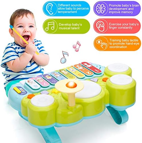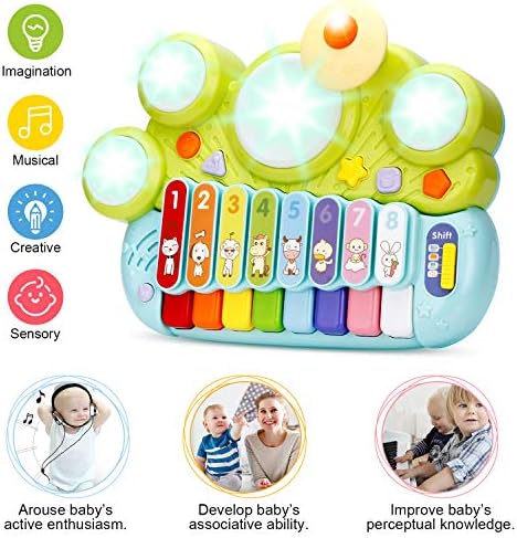 [Benefits to Baby’s Educational Development](1) Enhance your baby’s hand-eye coordination and finger flexibility while hitting hand drum and keyboard to enjoy various sounds; (2) Develop their cognitive recognition of colors, patterns and animals; (3) Encourage concentration. This educational instrument is a wonderful toy to nurture your baby’s intelligence, creativity, imagination, cognition, coordination, and auditory and sensory skills