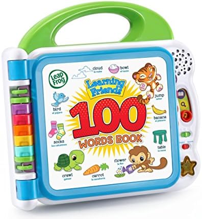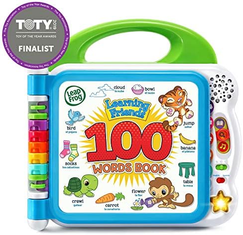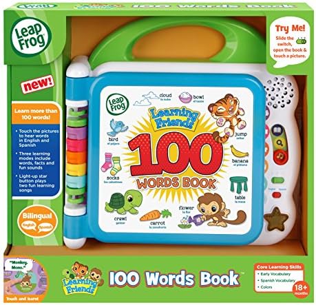 Join animal friends Turtle, Tiger and Monkey as they explore new vocabulary in the Learning Friends 100 Words Book. Explore the colorful pages and touch each picture to hear the animals say toddler-appropriate words along with exciting facts and sound effects. Immerse your child in bilingual play by sliding the language switch to hear the words, songs and instructions in Spanish. Touch the pictures to hear silly sound effects in Fun Sounds mode or press the light-up star button to hear two learning songs. Discover new vocabulary with cute learning friends! Intended for ages 18+ months. Requires 2 AA batteries. Batteries included for demo purposes only. New batteries recommended for regular use.