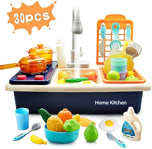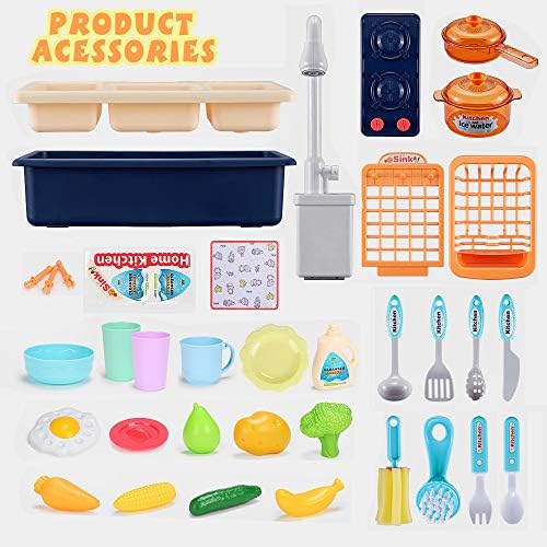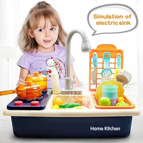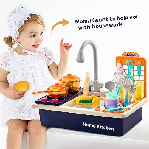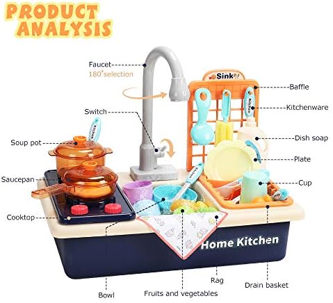 💦Play Sink with Running Water – Simulate life scenes,have the same function as real sinks, help children exercises hand-eye coordination ability,and the ability of organization and storage. and With Automatic Water Cycle System,you don’t need to press the water pump every time.Just switch it on,Insert three AAA batteries (not included),Cosplay starts immediately.