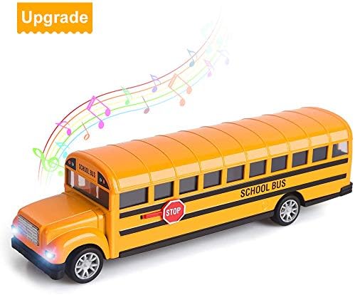 ☞【Upgrade Version with Light & Sounds】: This yellow color die-cast school bus with openable doors, press and pull back then release the vehicle, sound engine starts working and lights flash. Batteries already inside toy cars, when your kid get this gift toy, pull out partition insulator at the bottom, then can play the school bus.