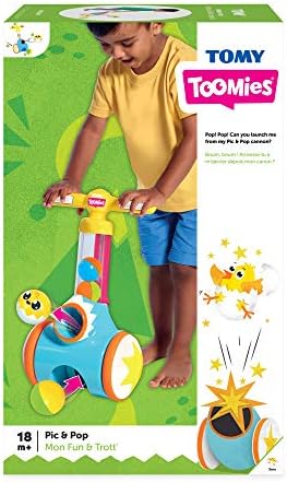 The Toomies Cannon Ball Pic & Pop is a distinct walk-behind toy that gets your toddler moving. One click of the button launches a colorful ball from the chute, your little one chases after the balls and simply rolls over them to magically pick it up and start the fun all over again. This simple to operate toy gets your toddler toddling and teaches your little one cause and effect. The Pic’N Pop Ball Blaster is ideal for use either indoors or outdoors.