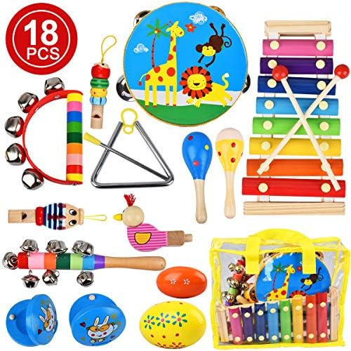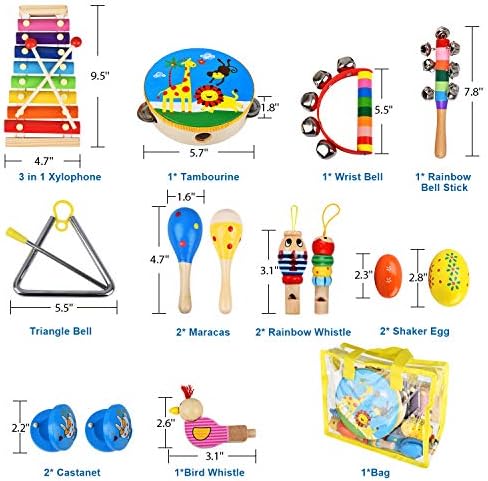♫【A Complete Musical instrument Set】18 pcs 10 types of rhythm instruments can give kids various game experiences, including shaking, tapping, beating, and blowing. This percussion set includes 3 in 1 Xylophone, Tambourine, Triangle Bell, Maracas, Shaker Eggs, Wrist Bells, Rainbow Bells, Castanets, Rainbow Whistle, Bird Whistle. Ideal and creative birthday present or Christmas gifts for kids, boys, or girls.